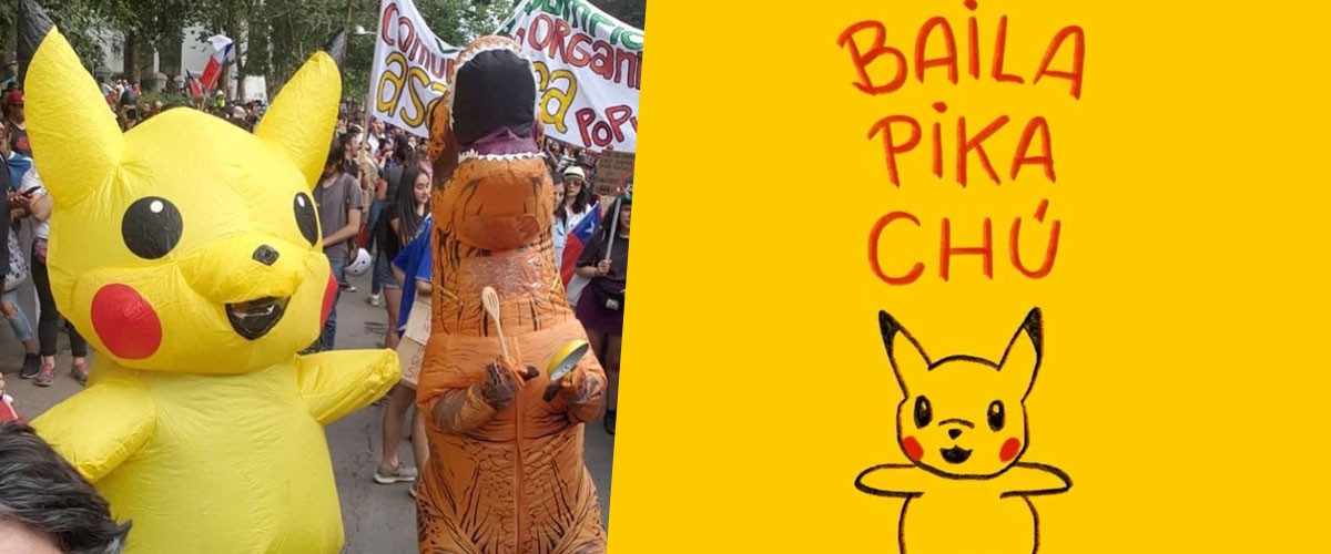 Las manifestaciones no han estado exentas de memes, algo que caracteriza a Chile es que como país podríamos tener una catástrofe natural y hacer memes al respecto, pero un momento que trajo algo de alegría a la gente fue ver como un corpóreo de Pikachu al son de las cacerolas bailaba, se cayó… Pero se levantó.